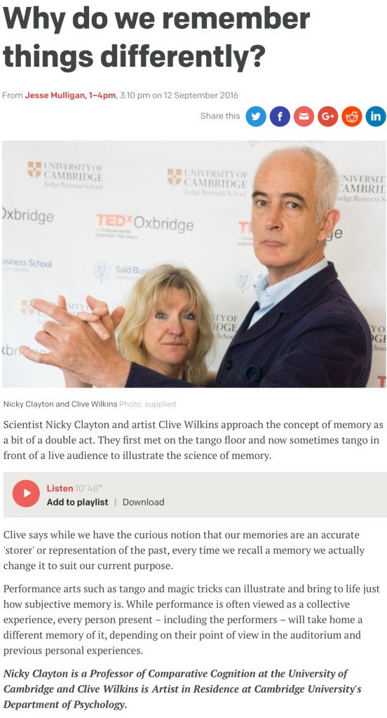 Click on the link and search ‘Why do we remember things differently’ or input ‘Nicky Clayton Clive Wilkins’ to hear the interview. http://www.radionz.co.nz